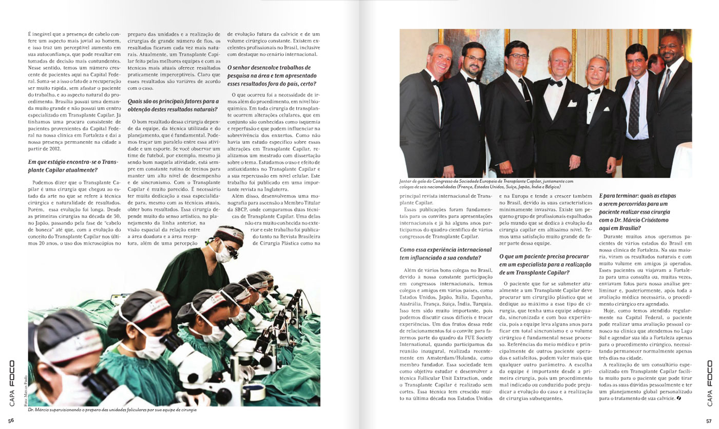 Com a reportagem de título “Uma Técnica Brasileira Ganha o Mundo”, o Dr. Márcio Crisóstomo foi destaque de capa da Revista Foco, de Brasília (DF) devido à sua presença constante atendendo na Capital Federal e ao destaque internacional da sua técnica Untouched Strip® para calvícies avançadas, que permite o transplante de um número maior de fios.