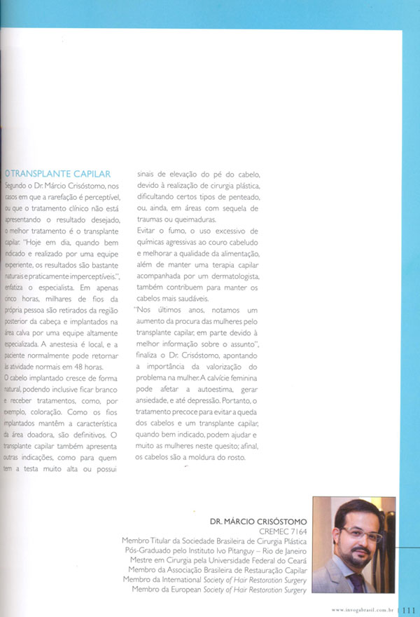 "O dr. Márcio Crisóstomo foi um dos destaques da matéria "Saude de Grife", da ultima edicao da revista O POVO Cenario, descrevendo medicos top em Fortaleza com atividade diferenciada e clientela de outros estados e países.".