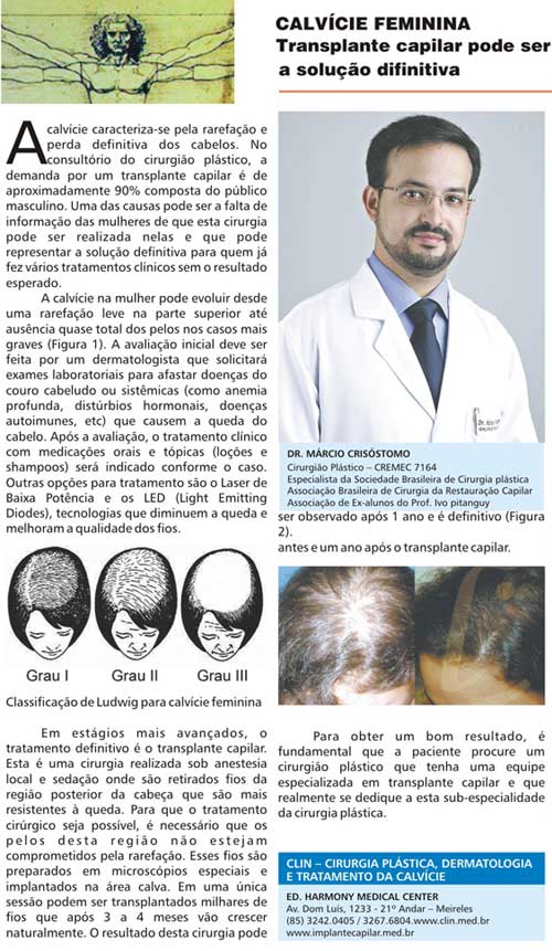 Read the article published on 12/10/2008 by Northeast Daily Journal with Dr. Márcio Crisóstomo on Female Baldness.